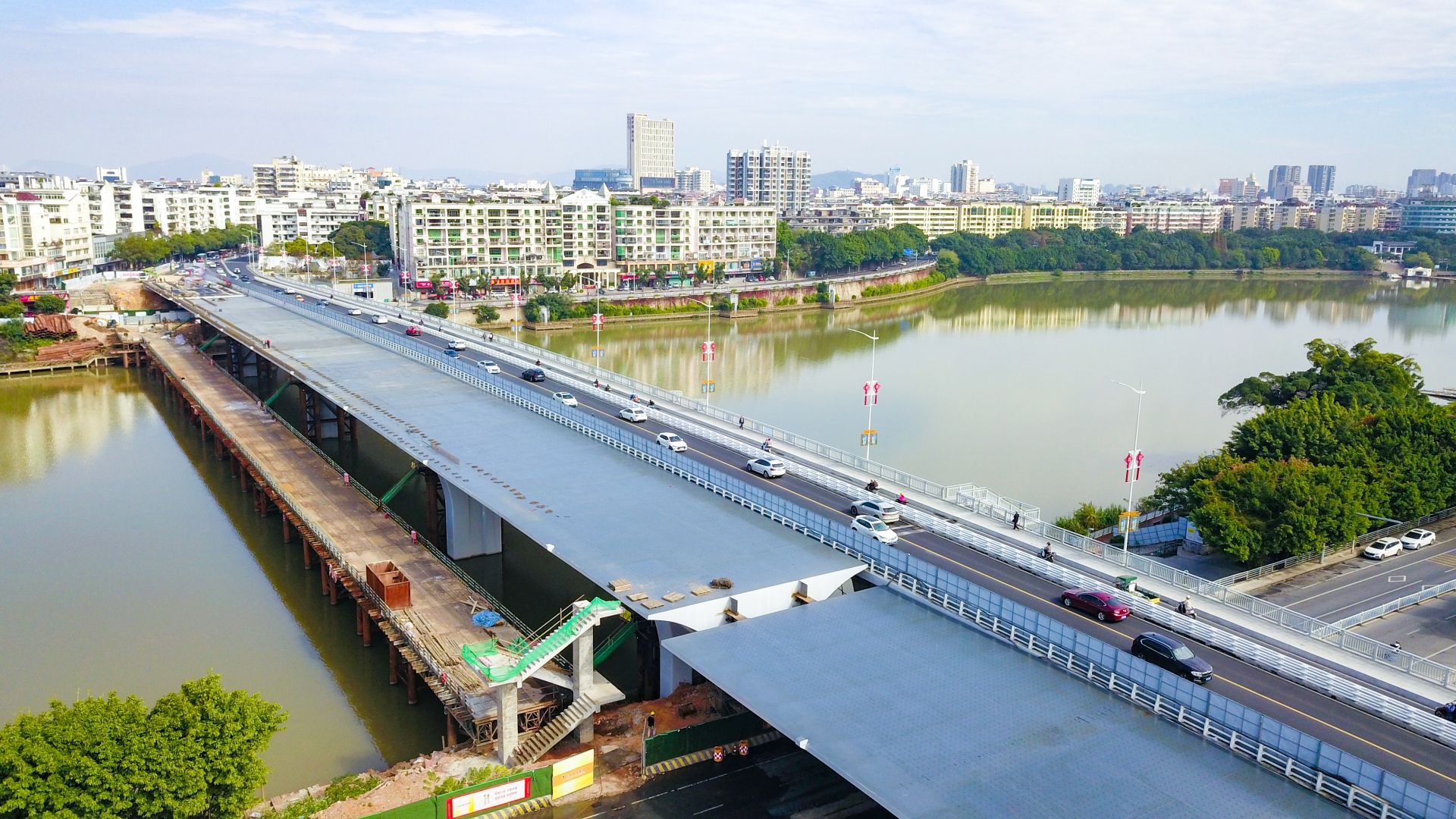 項(xiàng)目建設(shè)內(nèi)容包括拆除既有老橋,在老橋原位新建一幅18米寬橋梁;北岸東側(cè)新建一處地下車庫;西側(cè)改造現(xiàn)有景觀停車場(chǎng);長征大道增設(shè)一對(duì)連接章江南大道的匝道及相關(guān)配套專業(yè)工程等,總投資額3.7億元,施工合同工期為2年,計(jì)劃于2022年6月底完工。