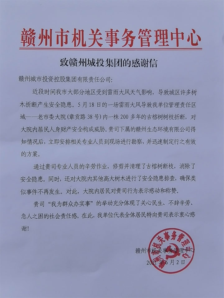 近日,贛州市機關事務管理中心發(fā)來一封感謝信,點贊贛州城投集團深入開展“我為群眾辦實事”實踐活動的感人舉動。