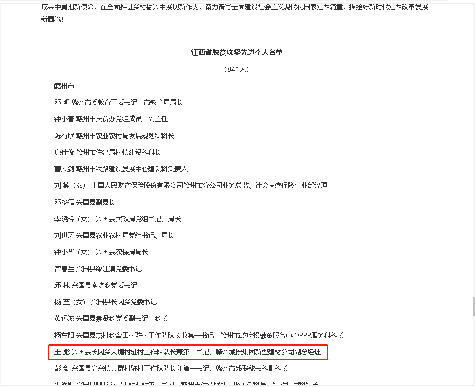 6月23日,省委、省政府召開(kāi)全省脫貧攻堅(jiān)總結(jié)表彰大會(huì),表彰一批在打贏脫貧攻堅(jiān)戰(zhàn)中作出突出貢獻(xiàn)的個(gè)人和集體,其中,興國(guó)縣長(zhǎng)岡鄉(xiāng)大塘村駐村工作隊(duì)隊(duì)長(zhǎng)兼第一書(shū)記,贛州城投集團(tuán)新型建材公司副總經(jīng)理王彪獲“江西省脫貧攻堅(jiān)先進(jìn)個(gè)人”榮譽(yù)稱(chēng)號(hào)。