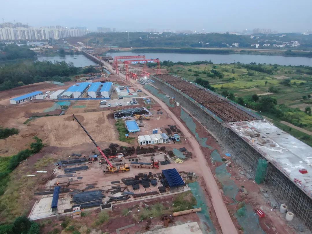 在蟠龍大橋項(xiàng)目,累計(jì)完成總工程量的35%,樁基、墩柱全部完成,蓋梁完成66.7%,主橋鋼結(jié)構(gòu)完成48%。