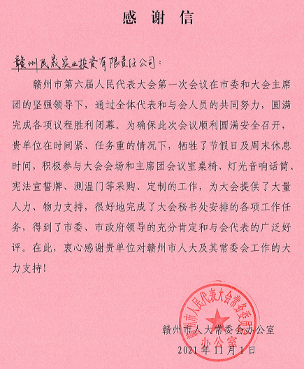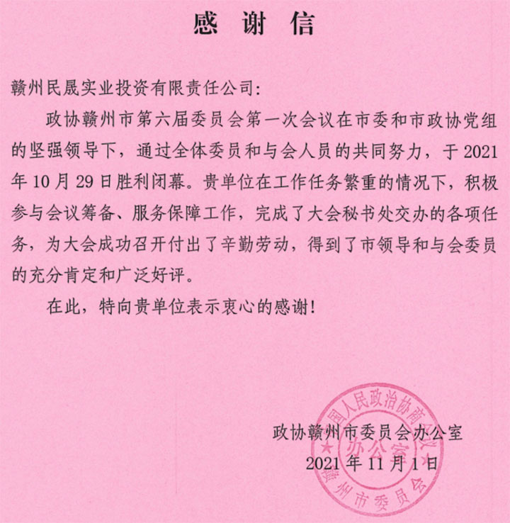 這次圓滿(mǎn)完成市“兩會(huì)”會(huì)務(wù)保障工作,并獲得市人大、市政協(xié)感謝信表?yè)P(yáng),是對(duì)集團(tuán)上下講政治、講擔(dān)當(dāng)、講大局的認(rèn)可與褒獎(jiǎng)。第三屆世界贛商大會(huì)召開(kāi)在即,大會(huì)開(kāi)幕式將在贛州大劇院舉辦,民晟實(shí)業(yè)公司等相關(guān)單位將再接再厲,熱情服務(wù)好各界賓朋,充分展示新時(shí)代國(guó)企的擔(dān)當(dāng)作為。