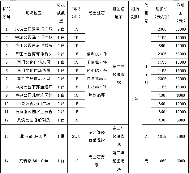 以上清單內容僅供參考,以現狀交付,拍賣公司和委托人不承擔瑕疵擔保責任,其中標的1-標的12僅提供場地,競得人負責花車經營設備投資、日常經營(包括經營秩序、場地保潔、垃圾清運、污水廢水處理)。