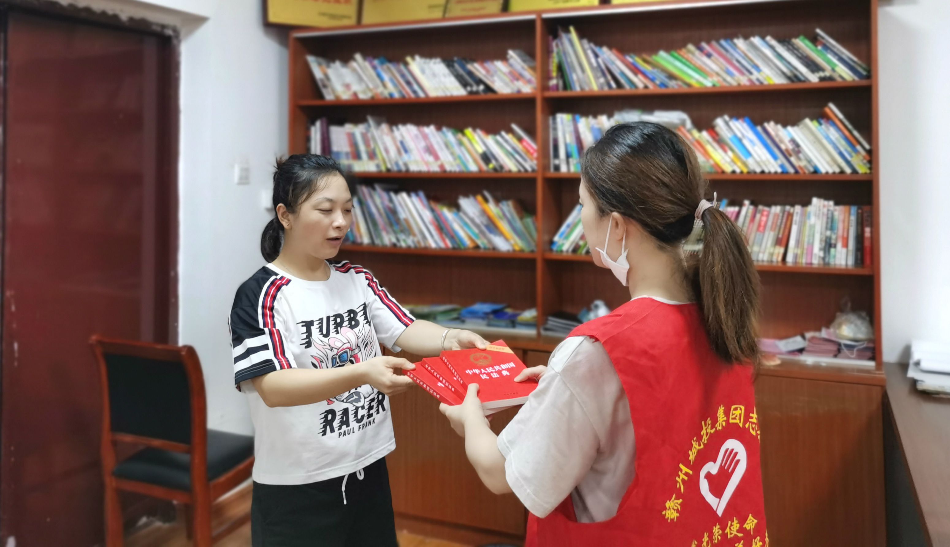 (上圖為7月9日贛州城投集團志愿者為社區(qū)書屋捐贈《民法典》)